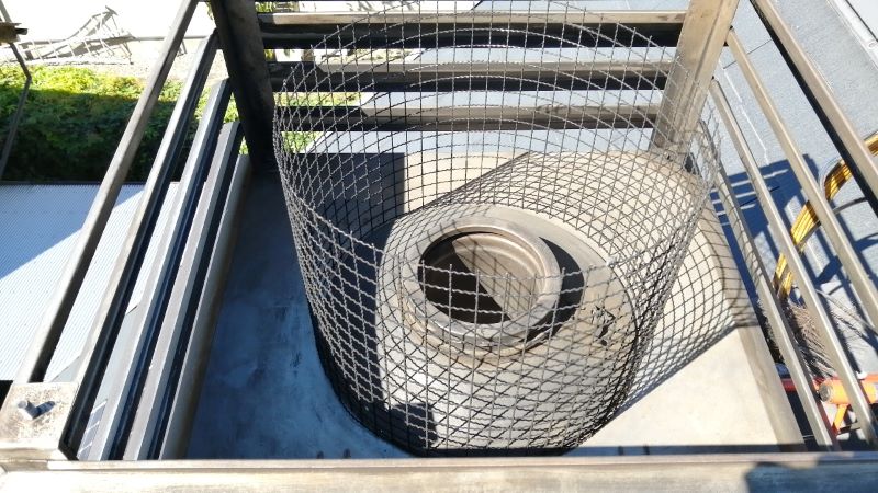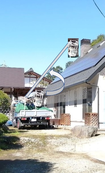 バケットトラックを使い傾斜45度の屋根の煙突でも保守します
