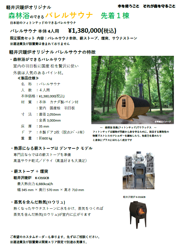 軽井沢暖炉オリジナル 森林浴のできる バレルサウナ